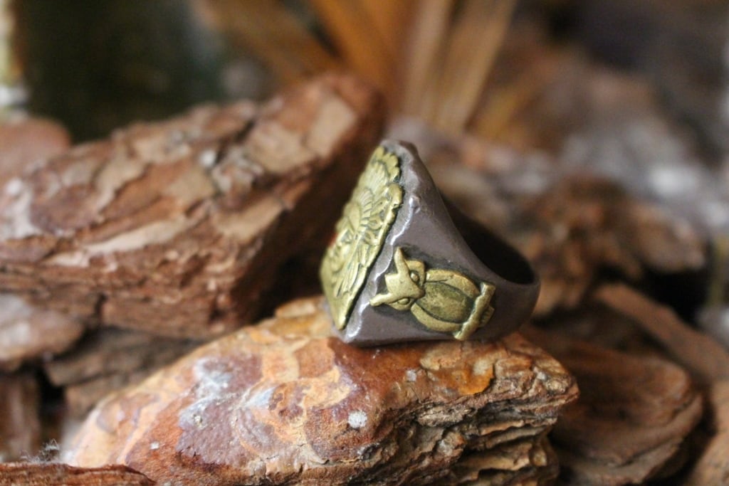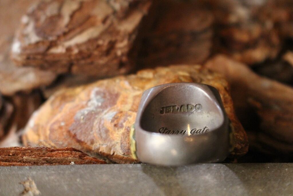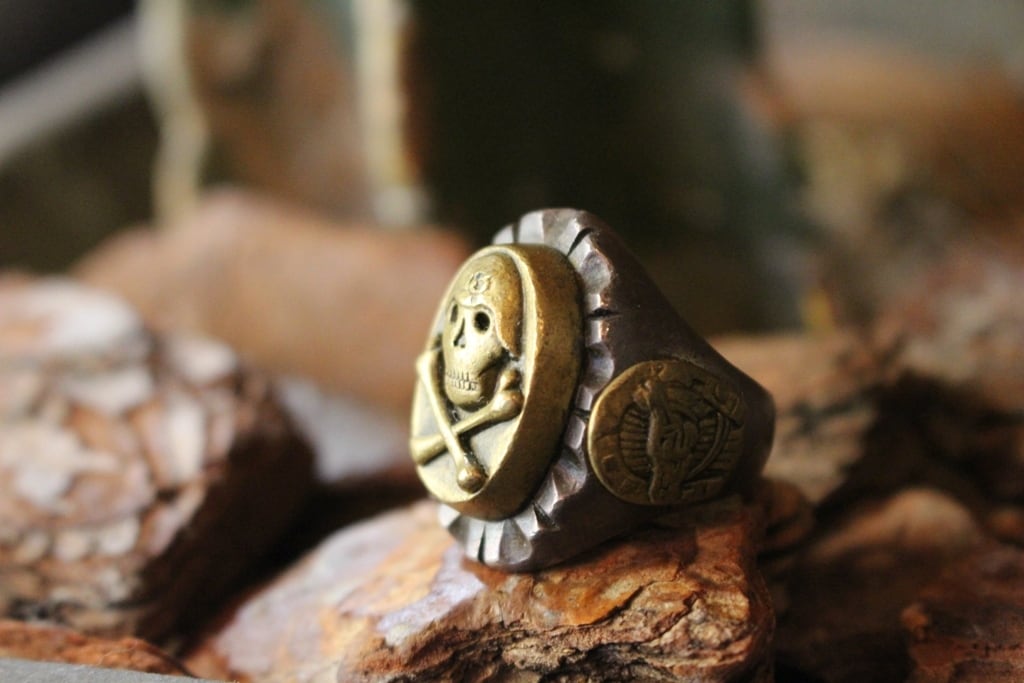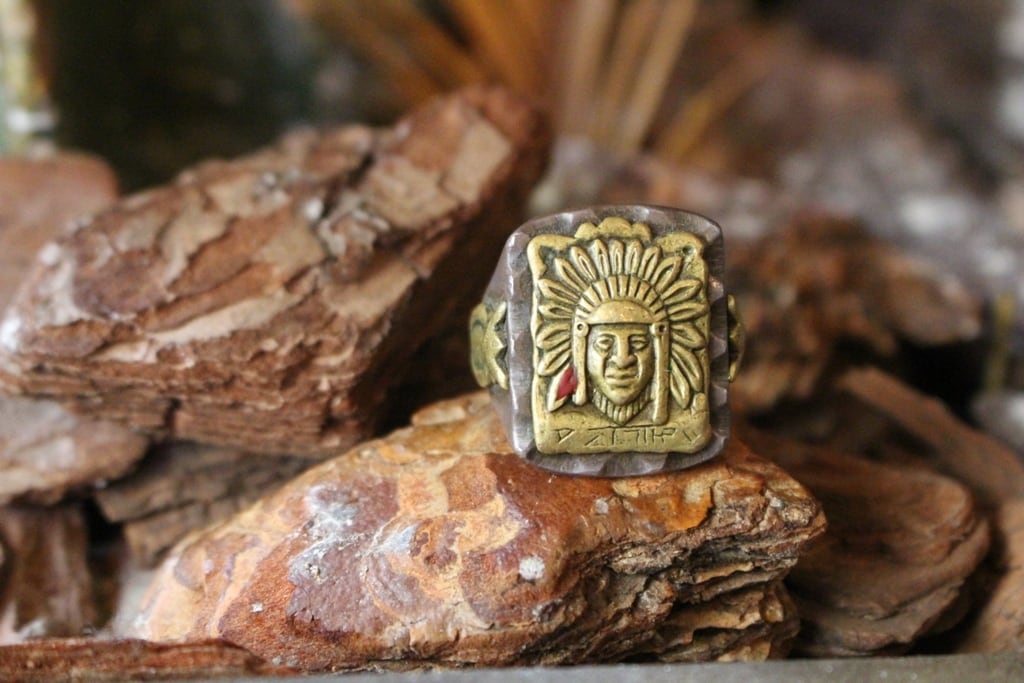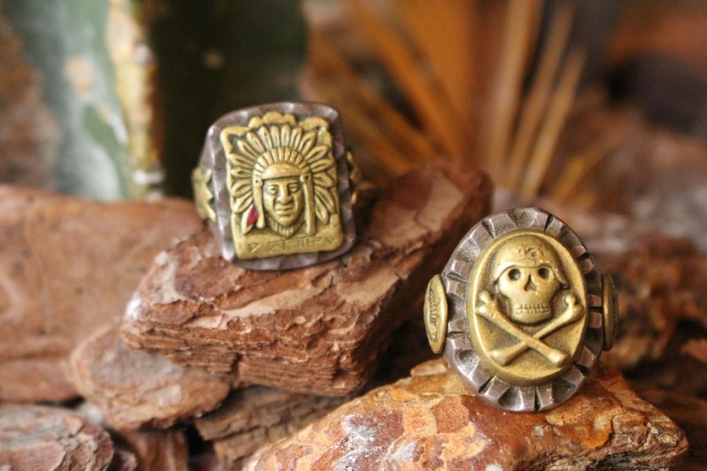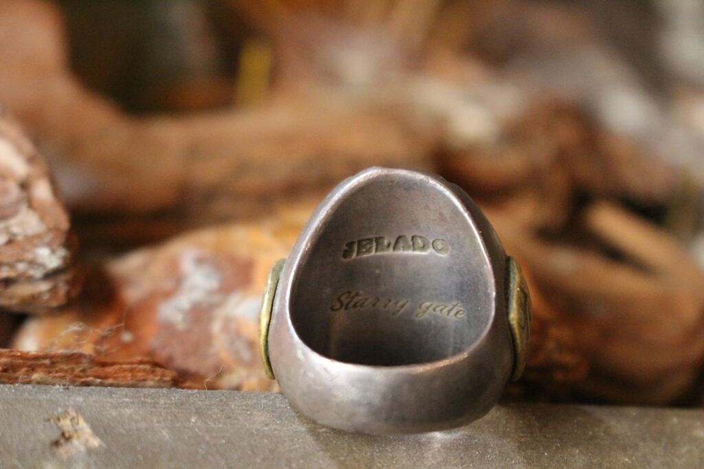古いビンテージ物でも取り扱われている柄をアレンジして作られたJELADOオリジナルのメキシカンリング。素材はシルバーで、上部とサイドは真鍮製。大柄で重量感があり、インパンクトのあるメキシカンリングです。