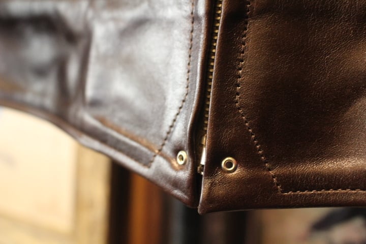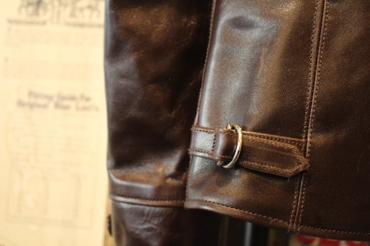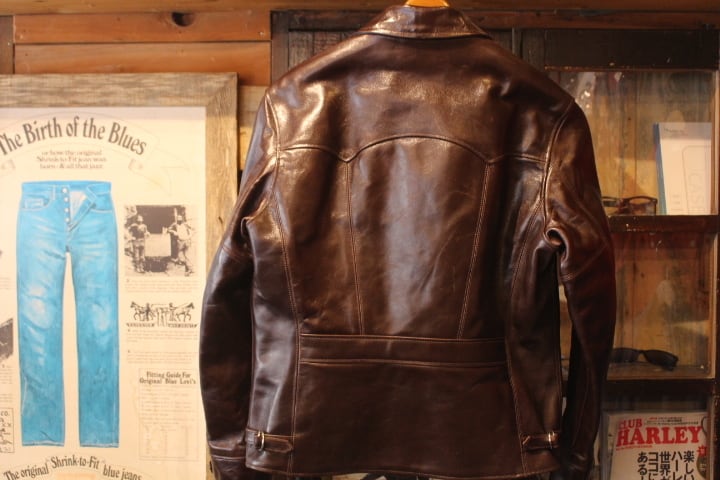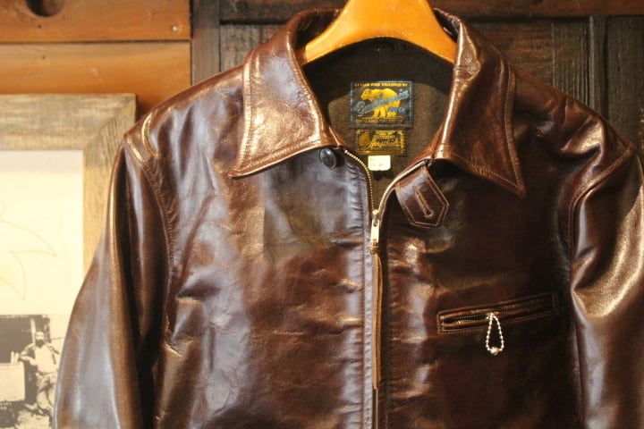 30年代ヘラクレススポーツジャケットベースにオリジナルパターンで仕上げられたジャケットです。素材は1.2mm厚のベジタブルタンニングホースハイド使用。裏地にはウールのメルトンを使用し、しっかりと保温性も保たれてます。